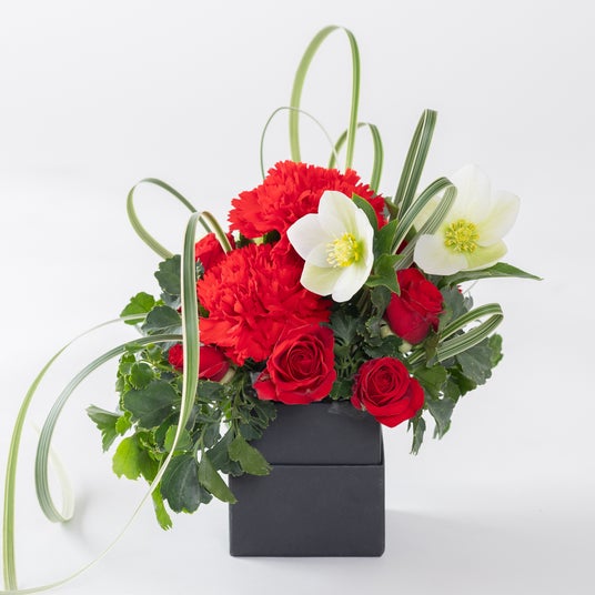●母の日アレンジメント(RED)定番の赤いカーネーションが鮮やかに咲き誇る、温もりと安心感に満ちたアレンジメント。