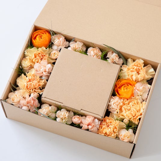 ●母の日フラワーボックス(ウォームカーネーション)カーネーションを中心とした温かく優しい色合いの花々が、贈り物を彩り特別な瞬間を演出。