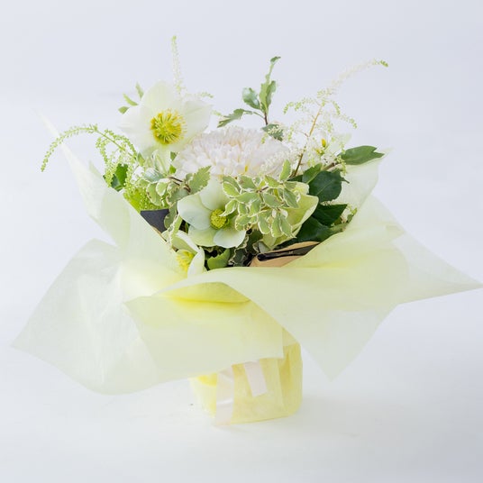 ●母の日アレンジメント(WHITE)優雅な白の花々とグリーンを組み合わせた、優しさと感謝の気持ちが伝わるアレンジメント。