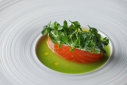 自然豊かな環境で育まれたサーモンと、青々とした旬のエンドウ豆を楽しむ一皿です。熟成サーモンのまろやかな旨みと、わさびを効かせたヨーグルトソースが織りなす爽やかな余韻を楽しめます。豆の歯ごたえ、ハーブの香り、酸味のあるソースが重なり合い、食べ進めるごとに食感と香りの変化を堪能できる春の一皿です。