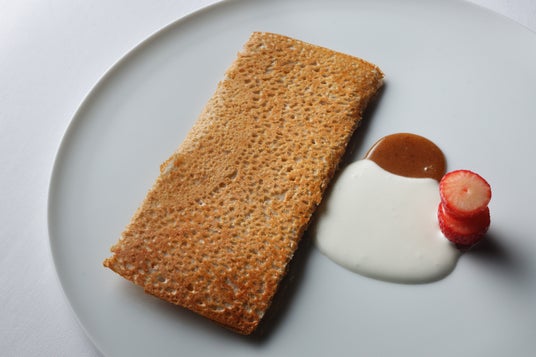 青森の食の風景を、フランス料理で表現したデザートです。香ばしく焼き上げた蕎麦粉のガレットは、サクッとした食感が心地よく、馥郁とした香りが口の中に広がります。そんなガレットに合わせるのは胡桃味噌です。南部地方のソウルフード「串餅」から着想を得た味わい方で、ほのかな甘みとコクを添え、味わいを深めます。シャンティー(*1)や苺とともに、洋のエッセンスを感じながらも、青森の暮らしに根づいた食文化を感じさせる一皿です。