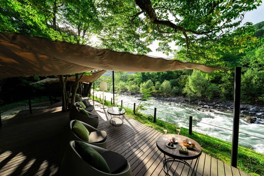 奥入瀬渓流の自然を感じられるテラス席とダイニングで、四季折々の大自然に癒されながらゆっくりと食事を味わえます。渓流沿いのテラス席は開放的で、瀬音を感じながらアペリティフを堪能できます。移りゆく季節を眺めながら、アミューズとシャンパーニュを味わう時間は、この上ない贅沢です。大きな窓を設えたダイニングからも四季折々の景色を眺めながらゆっくりと食事を味わい、特別なひとときを過ごせます。