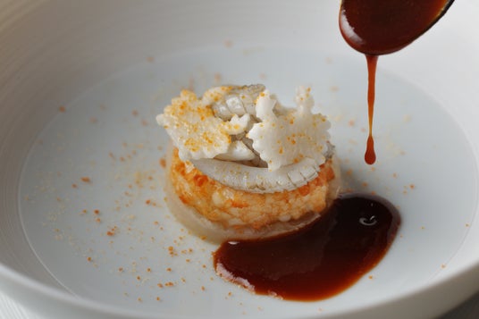 津軽地方の家庭料理である「イガメンチ」を再構築した一皿です。青森県の特産品である長芋のローストに、イガメンチと炭火で炙ったイカを重ね、弾力のある食感と香ばしさを引き立てます。力強い香りが際立つクリガニのソースとともに味わいます。クリガニは津軽地方の花見に欠かせない食材で、「貴重な海の幸を大切に食べる」という地域の食文化に倣い、殻まで使って旨味を引き出しました。一口ごとにイガメンチの味わいが深まり、津軽地方で育まれた食文化と地域の食材が紡ぐ物語を感じられます。