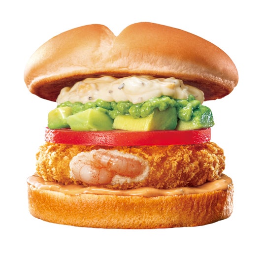 商品概要:プリプリサクサク食感のエビパティに、ボリュームたっぷりの大きさにカットしたアボカド、ワカモレソースを合わせ、スライストマト、特製タルタルソース、特製サウザンソースとともに、ふっくらなめらかな食感のバンズで挟みました。