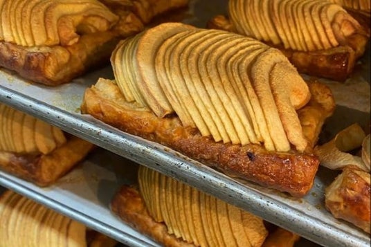 甘く煮込んだりなどの加工はせず、スライスしてパイにのせて焼き上げるため、りんご本来の食感や甘さ、酸味が口に広がります。