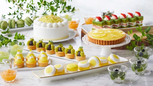 マスクメロンの香りと甘さが引き立つ「スーパーメロンショートケーキ」、さっぱりとした酸味を味わう「レモンのパイタルト」をはじめとする初夏を彩るフルーツや新緑の季節にふさわしい抹茶を使用したスイーツをご用意しました。
