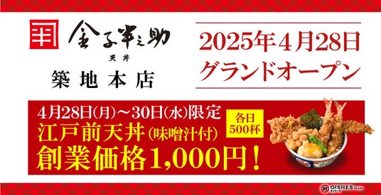 新たなフラッグシップ店舗「日本橋 天丼 金子半之助 築地本店」4月28日(月)オープン!3日間限定、江戸前天丼(お味噌汁付)を1,000円でご提供!