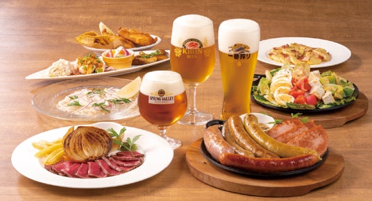 料理は、定番のソーセージやジャーマンポテト、人気の「あか牛の旨塩焼き」に加え、月毎に野菜や魚介などの素材が変わる『おすすめ素材メニュー』や3か月限定の『季節の特別メニュー』などがございます。