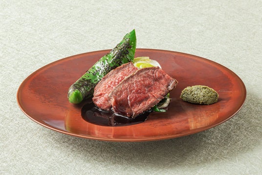 【肉料理】黒毛和牛ロースのグリエ 山椒マデラソース 京野菜を添えて
