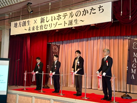 株式会社MAGMA(本社:東京都渋谷区、代表取締役:福永祐大)が運営する体験型リゾート「MAGMA RESORT」は、株式会社下部ホテル(本社:山梨県身延町、代表取締役:矢崎道紀)が運営する温泉旅館「下部ホテル」と、業務提携し「MAGMA RESORT Shimobe」のオープニングセレモニーを開催いたしました。当日は、銀行・行政・地域団体関係者をはじめ、報道機関、OTA関係者、インフルエンサー、地域住民の皆さまなど、総勢50名以上がご来場。本セレモニーでは、株式会社下部ホテルとの業務提携が発表されたほか、山梨中央銀行の斡旋により地域企業との連携の意向も示されました。こうした取り組みにより、地域経済への波及効果や、地場産業を活かした新たな観光資源の創出が期待されています。