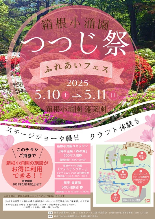 箱根小涌園 (所在地:神奈川県足柄下郡箱根町二ノ平1297、総支配人:柴田 訓)では、2025年5月10日(土)・11日(日)の2日間、箱根小涌園 蓬莱園(所在地:神奈川県足柄下郡箱根町小涌谷503)にて、箱根小涌園「つつじ祭りふれあいフェス」を開催いたします。