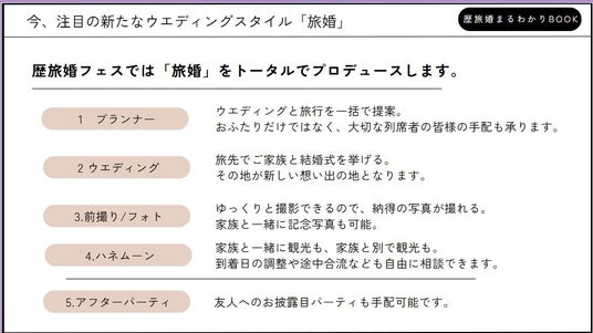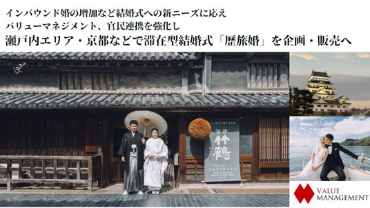 バリューマネジメント株式会社(本社:大阪府大阪市、代表:他力野 淳、以下、当社)は、インバウンド需要やZ世代を中心とした価値観の変化といった社会的背景を踏まえ、新たな結婚式のスタイルとして、瀬戸内エリアの自治体と連携し、周遊旅行・宿泊・挙式を一体化したウエディングツーリズムのパッケージ「歴旅婚プラン」の開発を進めております。本プランは、国内のカップルはもちろん、海外からの訪日旅行者によるウエディングニーズに応える内容となっております。つきましては、2025年4月27(日)より、国内のカップルに向けて「歴旅婚プラン」をご紹介する体験型イベント「歴旅婚フェス」を開催いたしますので、お知らせいたします。