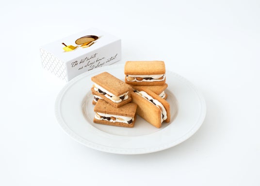 サブレ生地にライ麦酵母を直接火入れしたフレークと、ルヴァンリキッド(液体酵母)で熟成させた小麦生地をこんがり焼いたフレークを混ぜています。バゲットやカンパーニュのような熟成味、本格ドイツパンの熟成香、麦本来の力強い味をお楽しみください。 サブレ違いでハニービスケットと全粒粉のサブレの2種類を3個ずつ詰め合わせています。 フィリングは共通で、カカオリキュールに漬け込んだ甘みの強いカレンツレーズン、ローストした3種類のナッツ(アーモンド、カシューナッツ、ヘーゼルナッツ)の上にふんわり白いバタークリームをのせて、中には焦がしバターとトフィーのクリームをサンド。