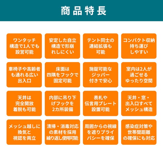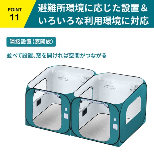 大規模災害時における避難所生活でのプライバシー確保や、更衣や授乳、トイレなど、生活する上での不自由さを解消し、避難生活でのストレスを大幅に軽減できる商品です。使いやすい様々な機能があるだけでなく、テント同士を繋げて拡張ができ、多用途に使うことが可能です!