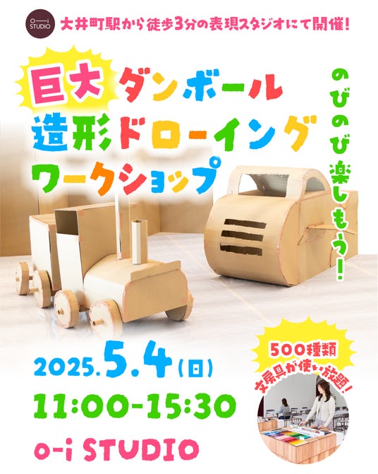 アトリエヤマダ株式会社(品川区、アーティスト 山田龍太)は、2025年5月4日(日・祝)に表現の体験型空間「o-i STUDIO」(品川区)にて、親子で楽しめる「巨大ダンボール造形ドローイング」を開催