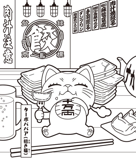 塗り絵の絵柄は、肉汁餃子のダンダダンで肉汁焼餃子をたくさん食べているターボババア(招き猫)です。