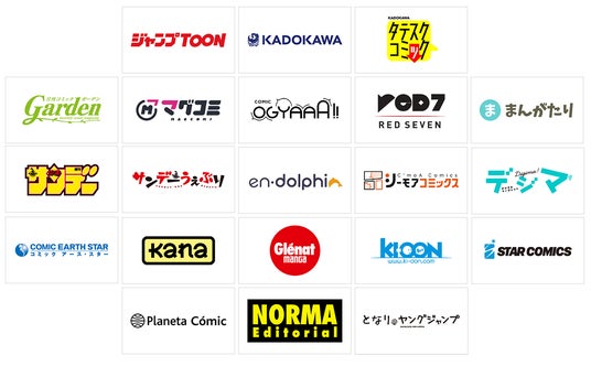 ジャンプTOON、KADOKAWA、TATESC COMICS、月刊コミックガーデン、マグコミ、コミックオギャー!!、レッドセブン、まんがたり、少年サンデー、サンデーうぇぶり、エンドルフィン、シーモアコミックス編集部、デジタルマーガレット、コミック アース・スター、Kana、Glenat Mang、Ki-oon、Star Comics、Planeta Comic、Norma Editorial、となりのヤングジャンプ