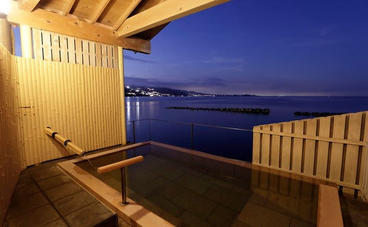 熱海では非常に珍しい、国道より海側に建っている最高のロケーションなので、伊豆半島随一のインフィニティ風呂です。当館を象徴する貸切露天風呂で、多くの利用者がインスタで絶景を共有して頂いています。湯舟のすぐ下に海があるため、熱海の景色と湯船が織り成すコントラストをお楽しみ下さい。
