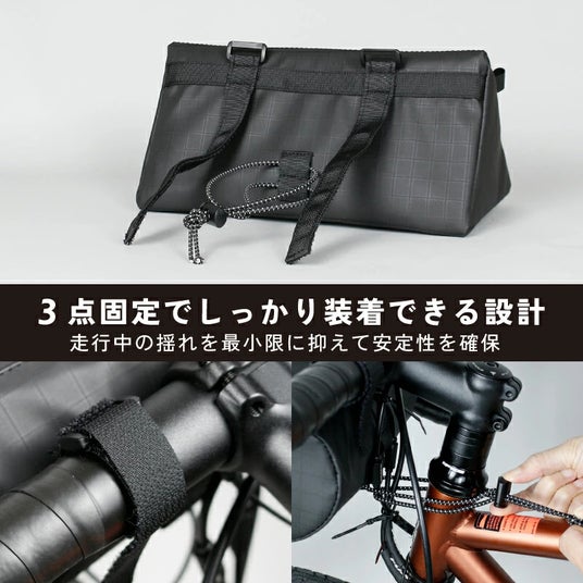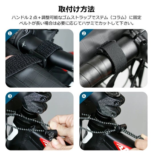 ハンドル2点+調整可能なゴムストラップでステムにも固定できる3点固定設計です。