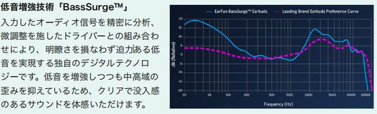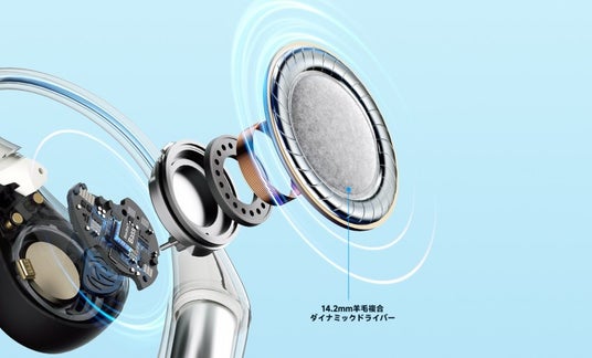 完全ワイヤレスイヤホンとしては圧倒的な大口径φ14.2mmウール複合素材振動板を採用、高音から低音まで幅広い音域を忠実に再生するドライバーを搭載しました。さらに独自開発の低音増強技術「BassSurge(TM)」を活用することで、オープンイヤー構造でありながら深みのある重低音を実現しています。