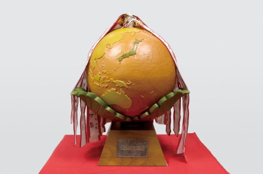 「木製地球儀」は、21世紀最初の全国植樹祭が開催された第52回山梨県大会の際に植樹祭のシンボルとして製作されました。森林・林業がさらに重要な役割を担うことをイメージした「木製の地球」で、「国民」「企業」「行政」が一丸となって3者の手で支えていく姿を「3枚の葉」で表現し、地球はヒノキ、葉はナラ、基台はケヤキで作られています。高さ60cm、幅50cm、重さ14.7kgの大きな地球儀で、開催都道府県に引き継がれています。