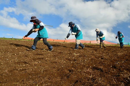毎年きれいに咲かせるために、雑草除去や霜よけシートの設置をはじめ、多くの人の手によりこの風景を作り出しいています。