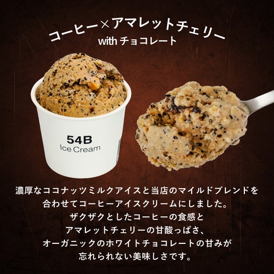コーヒー×アマレットチェリーwithチョコレート濃厚なココナッツミルクアイスと当店のマイルドブレンドを合わせてコーヒーアイスクリームにしました。ザクザクとしたコーヒーの食感とアマレットチェリーの甘酸っぱさ、オーガニックのホワイトチョコレートの甘みが忘れられない美味しさです。