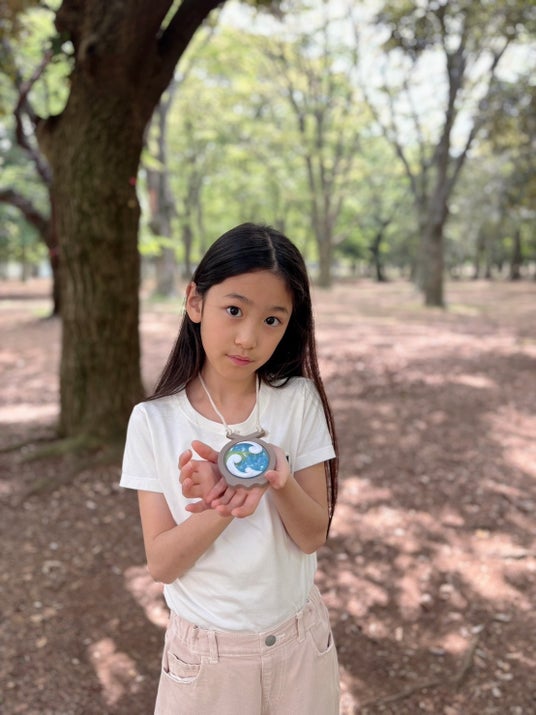 地球の妖精ラテールが住む不思議なペンダントがアースセイバーの証。同イベントでSDGsアクションを発表した小中学生を代表し、東京都のMireiさんにラテールのペンダントを授与。
