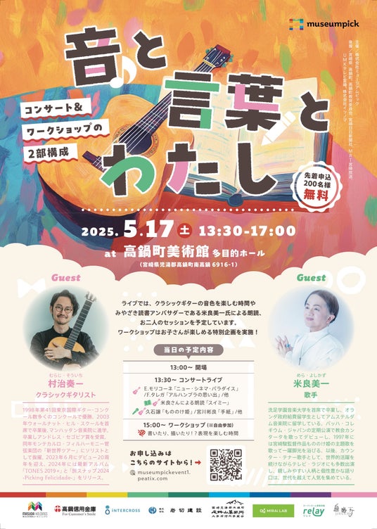 2025年5月17日(土)、高鍋町美術館にて、歌手・米良美一とクラシックギタリスト・村治奏一による親子向けコンサート「音と言葉とわたし」が開催されます。