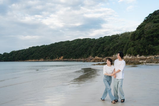 私服でビーチを散歩する、自然体なふたりの様子。