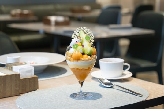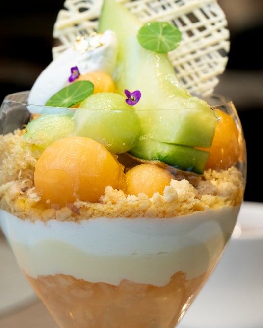 【アルマーニ / カフェ 表参道】2種類のメロンが奏でる、初夏の味覚。5月限定「メロン ジャスミン バジルのパフェ」