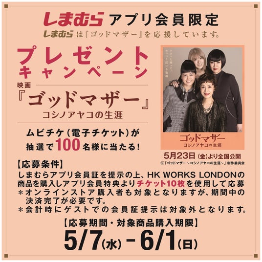 ブランド誕生15周年を記念して、5/23(金)より公開する映画「ゴッドマザー~コシノアヤコの生涯~」(https://godmother-movie.com)のムビチケが抽選で100名様に当たる、プレゼントキャンペーンを開催します。