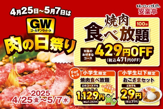 株式会社安楽亭(本社:埼玉県さいたま市、代表取締役:柳 先)は、2025年4月25日(金)~5月7日(水)までの13日間、家族みんなで楽しめる「GW 肉の日感謝祭」を開催いたします。