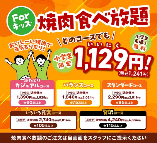 小学生はどのコースでも1,129円(税込1,242円)焼肉好きな子どもたちに朗報!どのコースを選んでも、小学生は特別価格で食べ放題OK。