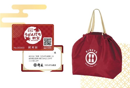 参加いただいた方にはうどん教室認定証と記念品を もれなくプレゼント!参加者全員にうどん教室認定証をもれなくプレゼント。また、万博のためにオリジナルで制作したトートバッグをセットにしてプレゼントいたします。