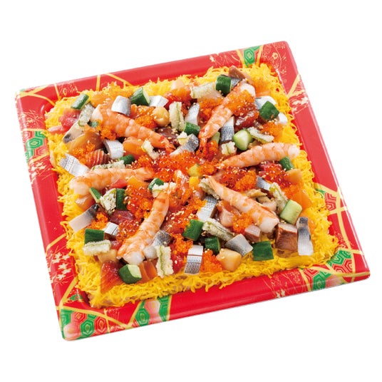 彩り豊かな10種類の海の幸を贅沢に盛り付けた特別なちらし寿司です。まぐろ、生サーモン、はまち、貝柱は特製のタレに漬け込み、風味豊かに仕上げました。