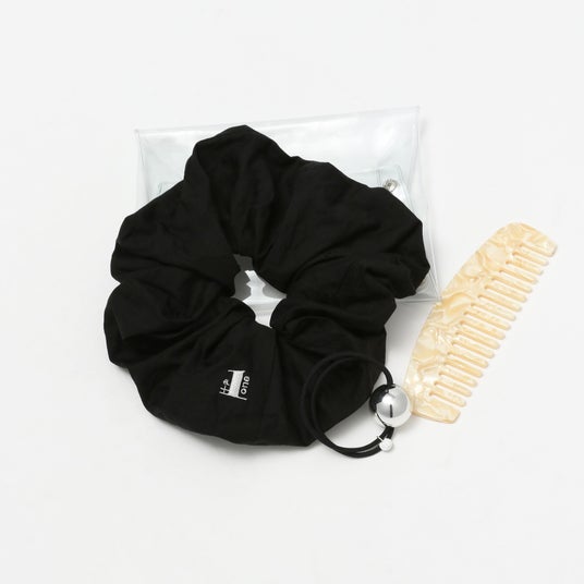 この春トレンドのビッグシュシュ、チャーム付きヘアゴム、コームの3点とビニールポーチのセットです。