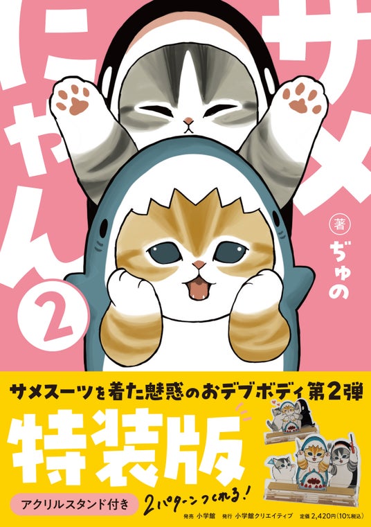 通常版と同時発売の特装版は、本書でしか手に入らない「限定アクリルスタンド」付き。サメにゃんのほか、シャチにゃんとちびにゃんと一緒にケーキを食べる様子をアクリルスタンドで表現しました。パーツを組み合わせて2パターン作れる、ファンにはたまらないアイテムです。