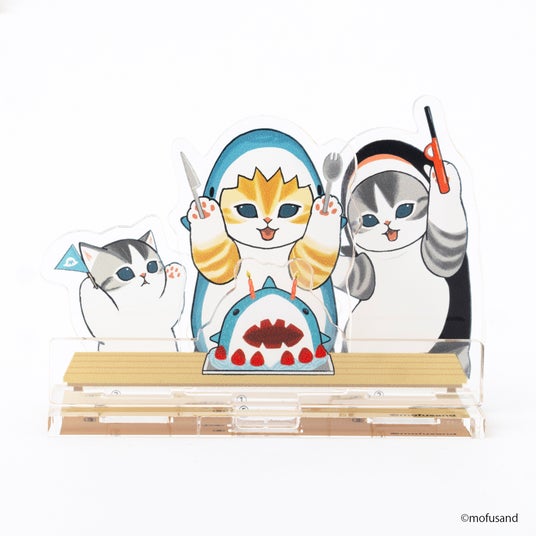 サメにゃんのほか、シャチにゃんとちびにゃんと一緒にケーキを食べる様子をアクリルスタンドで表現しました。パーツを組み合わせて2パターン作れる、ファンにはたまらないアイテムです。