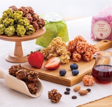 「pon pon Ja pon」ブランドの看板商品「pon pon coco(ポンポンココ)」は、大阪名物「おこし」の伝統技術が活かされた、軽やかな食感と洋菓子のような斬新なフレーバーの「ひと口サイズおこし」です。