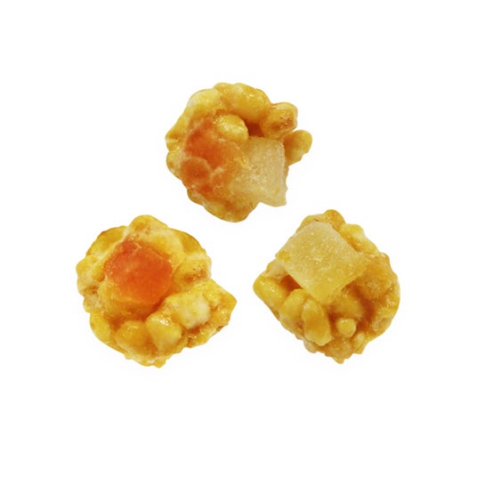 バナナソースとオレンジソースを生地に練り込み、パイン、パパイア、マンゴーの3種のドライフルーツをごろごろ加えることで、まるで“ミックスジュース”のようなフルーティーな味わいを再現。口に広がる甘く爽やかな香りと、おこしのサクサク食感、ドライフルーツのほどよい噛みごたえがクセになる、新しいおいしさです。
