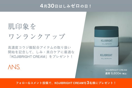 シミが気になり始めるこれからの季節。ANS.ではしみゼロの日を記念して取り扱いを開始するコウジ酸が高濃度配合された「KOJIBRIGHT(コジライト)クリーム」を抽選で3名様にプレゼント致します。