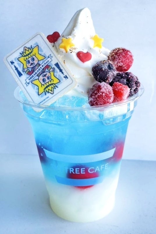 ライチと乳酸菌飲料の二層仕立てのドリンクにたっぷりのスカイソフトをON!さわやかな味わいのフロートドリンク。かわいいトランプ柄のもなか付き。