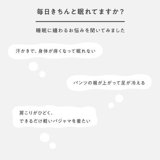 眠りについて、多くの方がお悩みなのでは?という思いから、当店のお客さまにインタビューをさせていただきました。お客さまお一人お一人とお話する中で実感したのが、お肌に一番近く触れる「パジャマ」に対してのお悩みでした。