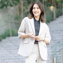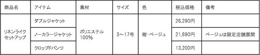 「リネンライクセットアップ」は、暑くなるこれからの季節に嬉しい麻調のさらっとした肌触りと上品な光沢感が特長。単品でもお使いいただきやすいダブルジャケット・ノーカラージャケット・クロップドパンツを展開しております。