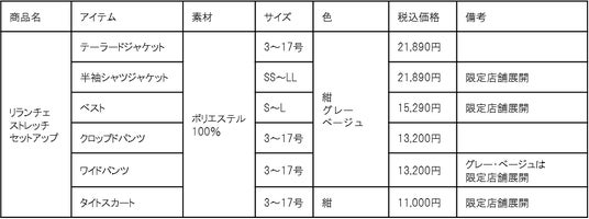 「リランチェストレッチセットアップ」は、定番のテーラードジャケットやクロップドパンツに加え、トレンドの半袖シャツジャケットやメンズライクなベスト等、好きなスタイルを選べる幅広いデザインバリエーションをご用意。セットアップでも単品でもさまざまな着こなしが叶います。