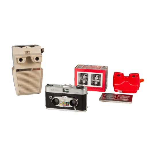 (左から)トーキング・ビュー=マスター/GAF/1970年、ビュー=マスター・ステレオ・カラー・カメラ/キング/1961年頃、「多次元バージョン」/ジム・ポメロイ/1988年