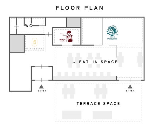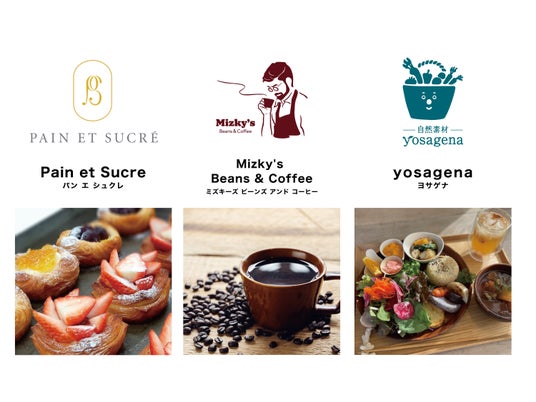 テラス席を備えたフードコート式の本施設には、千葉県柏市に店舗を構えるベーカリー「Pain et Sucre」、スペシャルティコーヒーストアの「Mizky’s Beans & Coffee」、千葉県柏市根戸で人気のオーガニック食品販売・飲食店「yosagena」の3店舗が並び、イートインスペースでは各店の購入品を自由に飲食をお楽しみいただけます。