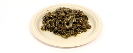 ゴールドの神秘的な輝きと黒い宝石をイメージしたイカスミパスタ