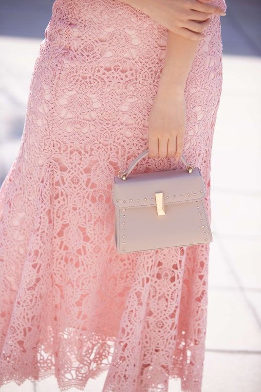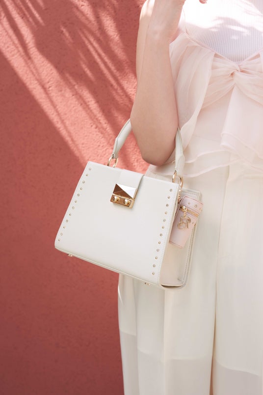 甘いピンクコーデにスタッズ付きの小物を合わせて大人っぽくも着こなせるのも新鮮でした。